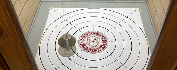 Nick Hildebrand / Friday, April 23, 2021 / Categories: All News, Academics, STEM, Computer Science, Mechanical Engineering, Physics Rockwell’s Foucault pendulum is swinging again Grove City College’s Foucault pendulum is swinging again thanks to a pair of students who were initially puzzled by the device. Roommates Mackenzie Gongaware, a sophomore Mechanical Engineering major, and Grace Barnes, a sophomore Computer Science major, noticed the pendulum last spring as they passed through Rockwell Hall of Science. Meant to be a dynamic and visible demonstration of the Earth’s rotation, instead it hung motionless, in the dark behind a glass door on the first floor. “We got weirdly intrigued by it,” Barnes said. “We didn’t know what its purpose was, but the sign behind it told us to check its position throughout the day, so we would visit it periodically and look for any changes.” And, despite the women convincing themselves more than once that the pendulum moved, it hadn’t. Not for a while. The Foucault pendulum is supposed to demonstrate the rotation of the Earth as a steel bob, suspended from a fixed point in the ceiling, swings back and forth, its arc methodically moving 360 degrees with each turn of the Earth. But that had not happened in years. While it was part of Rockwell’s original design, the pendulum has a spotty history. For most of the building’s 90 years, it hasn’t been in regular use. The sign was likely a left over from the 1990s, the last time it was repaired. Gongaware and Barnes thought “it was sad to see a noteworthy part of Rockwell’s history being forgotten,” and out of curiosity and a desire to see the pendulum actually work as advertised, they reached out to the Physics faculty about repairing it. “When Grace and Mackenzie approached me last fall about their interest in getting it swinging again, I thought it was a terrific idea,” Dr. James Clem, assistant professor of Physics said. “Since I started here in 2013, I’ve had some interest in getting it going again, but never had the time to devote to it.” Clem agreed to advise them, but both students passed on the opportunity to get academic credit for the project, which they saw as a distraction from schoolwork. “They saw it and they wanted to do something about it,” Clem said. “Not for credit, but just to satisfy their curiosity. It’s what all good scientists do.” Gongaware and Barnes found there was nothing significantly wrong with the pendulum’s steel bob or the wire that it swings on. The problem with the pendulum was one of power. While one can start a pendulum easily enough with a little push, air resistance and friction will eventually stop it. “It’s like a kid on a swing, if you do not have someone to push them and they are not pumping their legs, they will eventually come to a stop,” Barnes said. “To keep the pendulum in motion, there is a driving mechanism underneath the floor that exerts magnetic forces on the steel bob.” That mechanism, which is activated when the bob swings over a sensor, was added to the pendulum when it was completely overhauled in the 1990s and had stopped working. “That circuit is what needed the most attention,” Gongaware said. With some help from the Electrical Engineering Department, they were able to rewire the device. “We reinstalled the circuit and from there it was a lot of trial and error and changing variables to get it to both swing without dying down and complete its cycle,” she said. Thanks to a camera that Clem installed, they were able to monitor the pendulum remotely and calibrate it accurately. “Now, the pendulum is both swinging constantly and at the correct rate,” Gongaware said. Each Foucault pendulum completes the cycle at a different rate depending on its location’s latitude. At the North Pole, it takes the same 24 hours that the Earth does to turn on its axis. In Grove City, the cycle is completed in roughly a day and a half – 36 hours and 22 minutes. To make sure the pendulum stays on track, freshman Physics major Brynn Graybill is working on a program to monitor its movement more accurately. Leon Foucault designed his namesake pendulum around 1850 and put it on display in 1851 at the Paris Observatory. It is a simple experiment that very visibly demonstrates an established scientific fact and, in the last century, Foucault pendulums became a mainstay of museums, public buildings and college science centers. There is one at the United Nations headquarters in New York and another in the Children’s Museum in Pittsburgh, which used to be the Buhl Planetarium. The original Rockwell Hall version was simple – a metal bob hanging from a wire inside a well about the size of a closet that went from the basement to the third floor. It was apparently started manually and stopped naturally. By the mid-1960s, the pendulum had fallen into a state of disrepair and it stayed that way until Dr. James Downey ’81, an alumnus and former Physics professor, oversaw a complete overhaul and upgrade. Then, as now, the work was largely completed by students who really wanted to see the pendulum become operational. When he joined the faculty in 1992, Downey said the pendulum was in bad shape. The bob was missing, the steel wire it had hung on needed to be replaced and the experiment meant to make an unseen scientific fact visible was hidden away, behind closed doors that looked more like they opened to a broom closet than a device to spark scientific wonder. “I was a Physics major at Grove City, and I did not even know the pendulum shaft was there,” Downey said. Working with students and College maintenance staff, Downey had the base of the pendulum moved from the basement to the first floor to accommodate the force driver and increase the device’s visibility. The solid wooden door to the well on that floor was replaced with a glass window. Lights and the signage that so intrigued Gongaware and Barnes wa